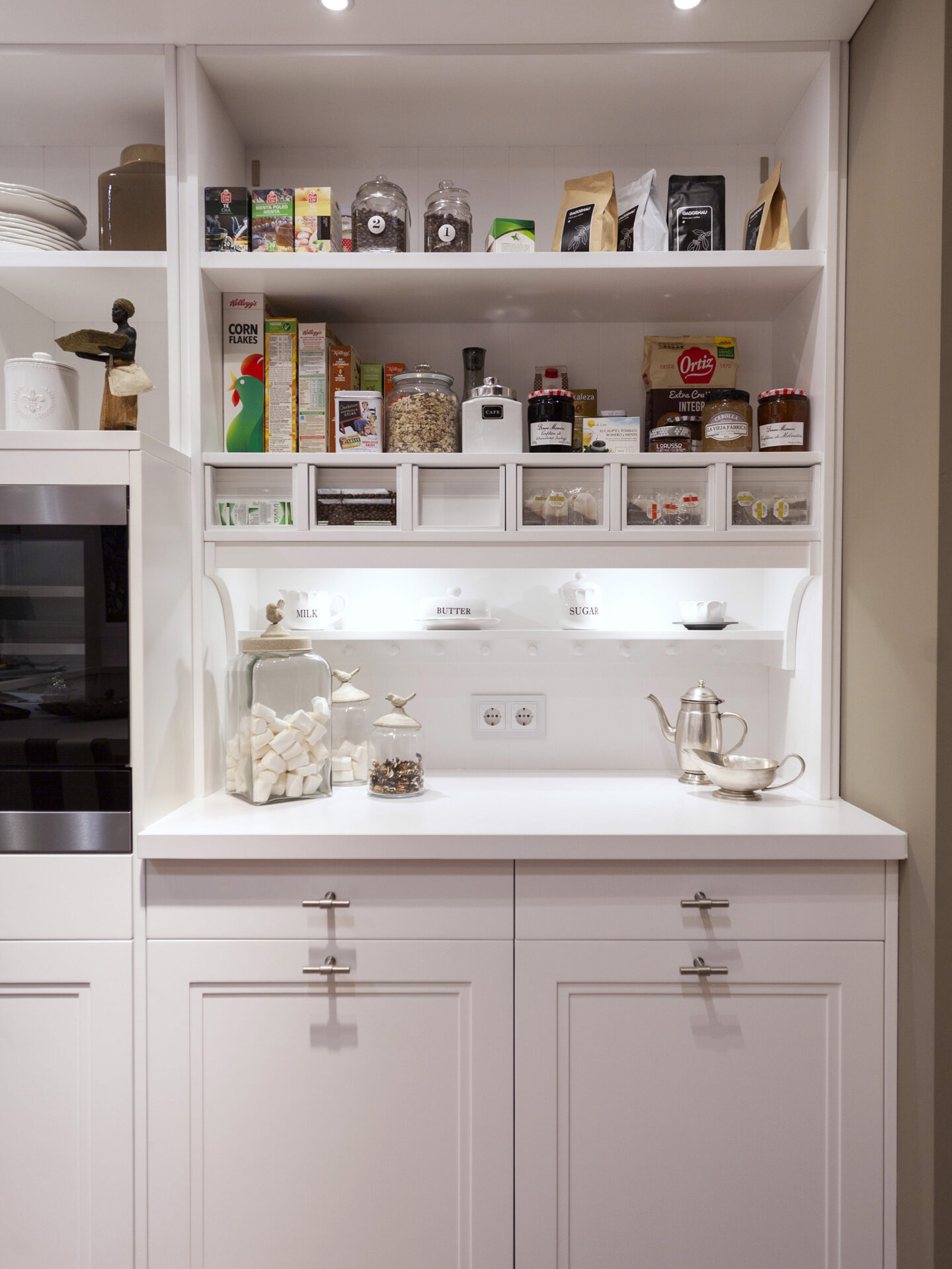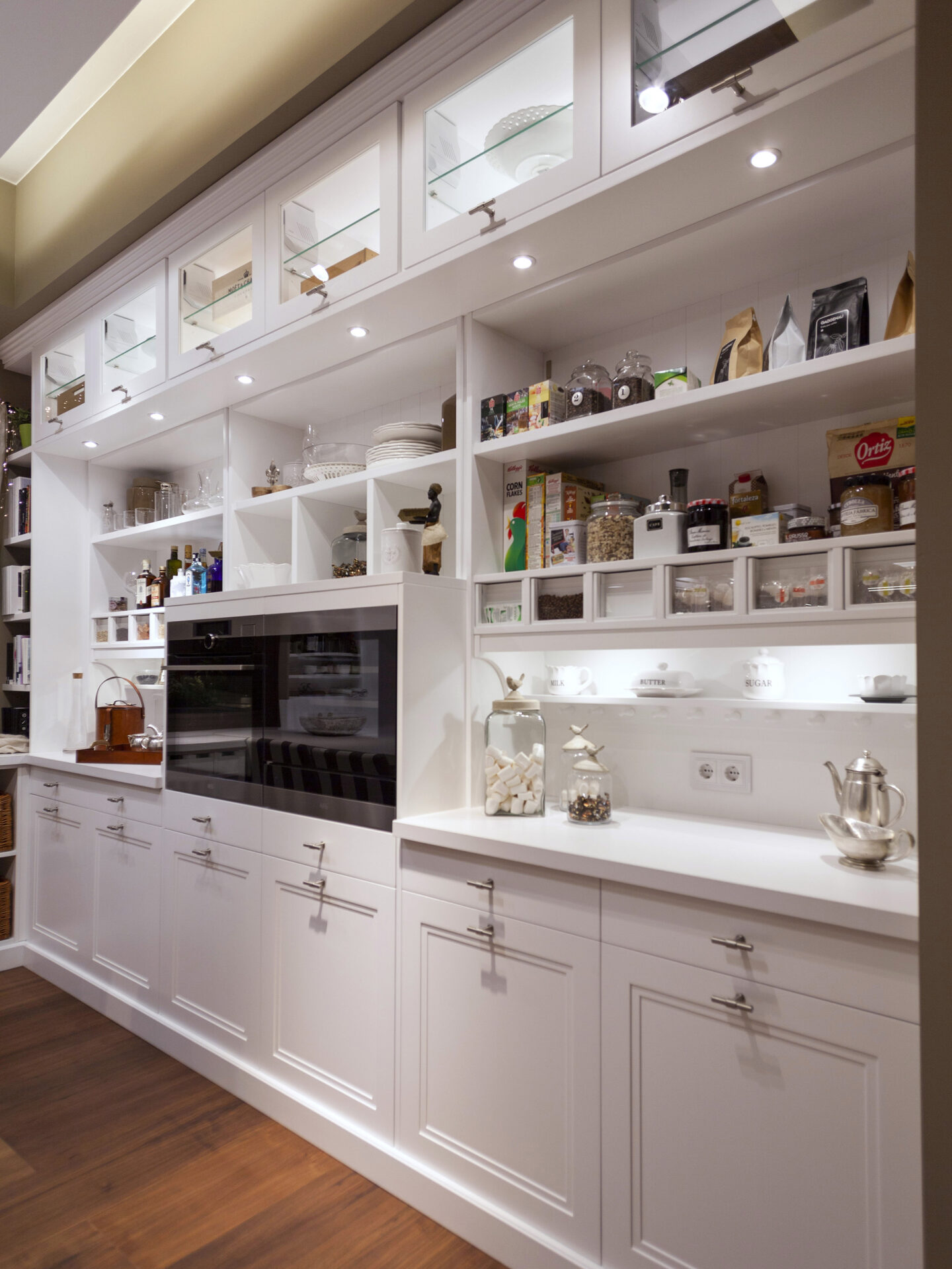 Cocina atemporal color beige con vitrinas