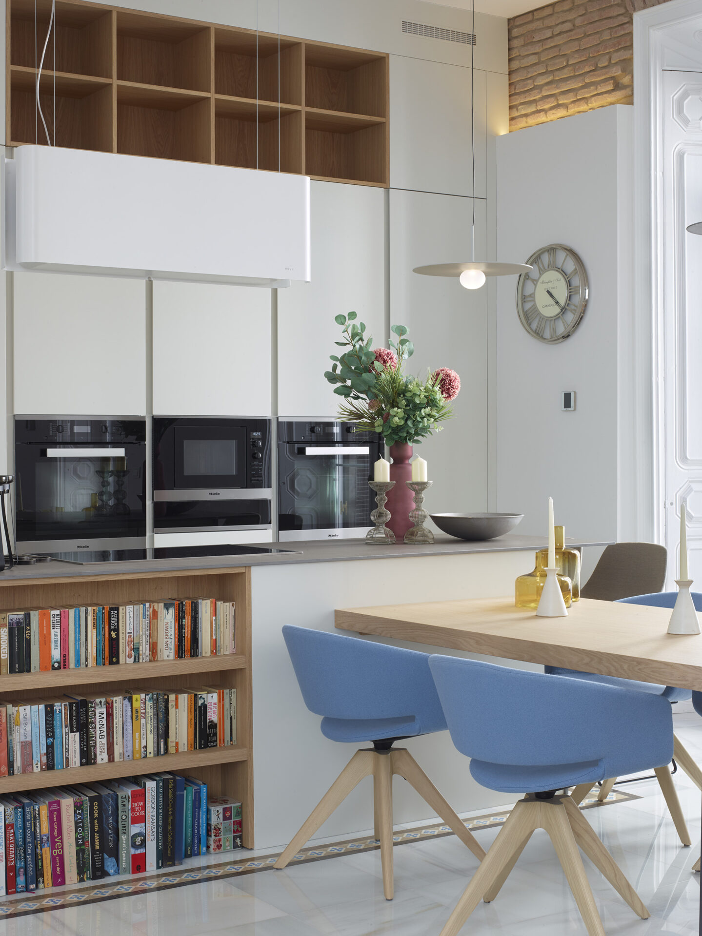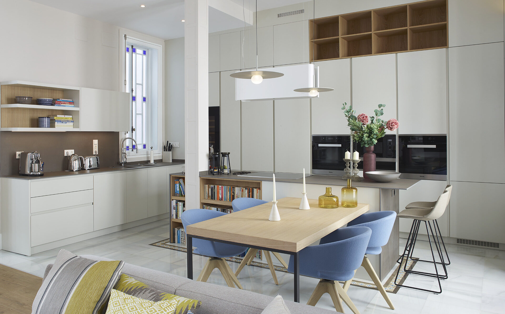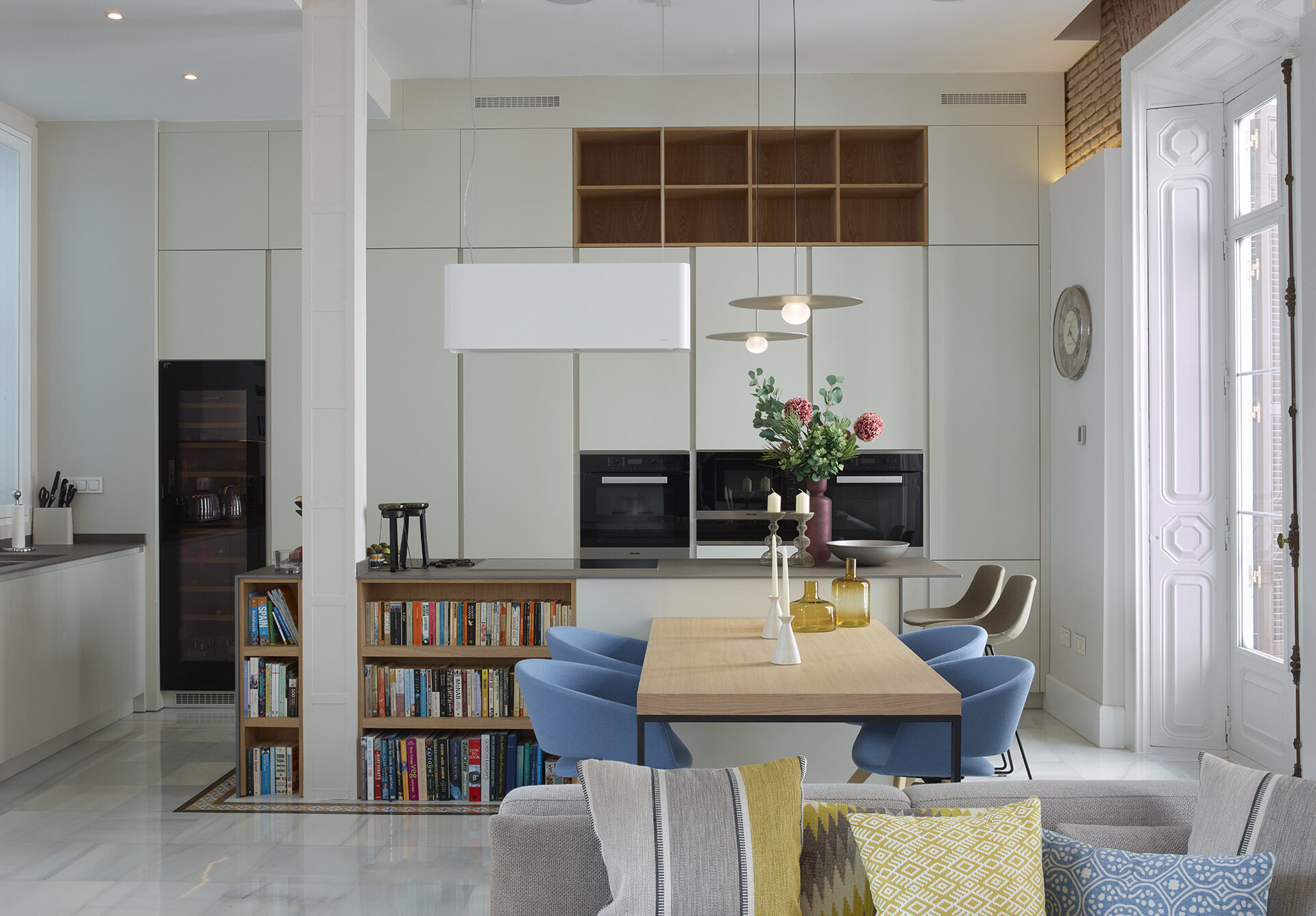 / Cocina con isla color blanco y madera clara