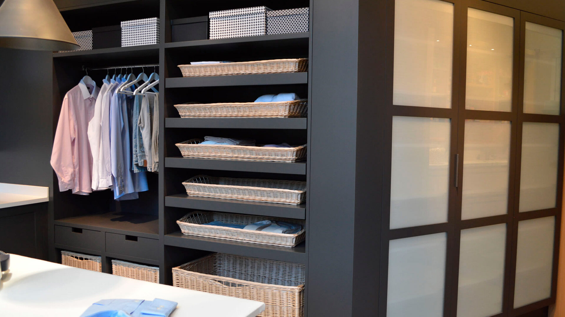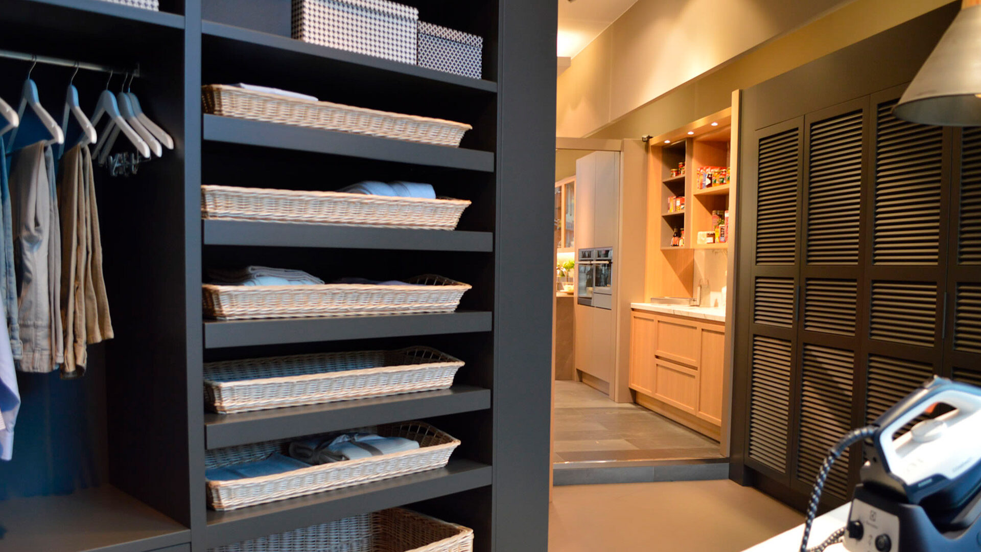 Diseñada para maximizar la funcionalidad sin renunciar a la estética, este espacio destaca por su combinación de tonos oscuros, texturas naturales y acabados modernos, creando un ambiente elegante y acogedor. El mobiliario incorpora estanterías abiertas con cestas de mimbre, ideales para organizar la ropa recién lavada, mientras que la barra de colgado permite mantener las prendas impecables después del planchado. La encimera amplia y el fregadero integrado completan una distribución pensada para facilitar cada tarea. Esta lavandería no solo optimiza el almacenamiento y la organización, sino que transforma el cuidado de la ropa en un ritual de confort y estilo. Un espacio donde la practicidad se encuentra con el diseño para hacer de cada tarea un placer.
