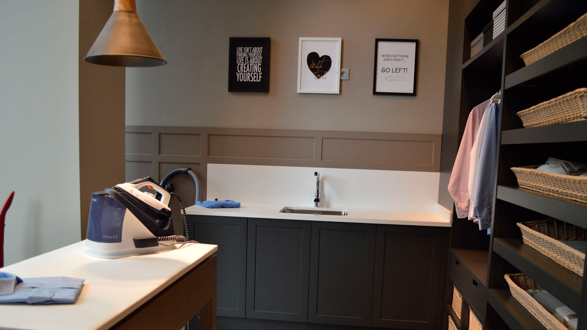 Convierte la rutina del cuidado de la ropa en una experiencia de orden y sofisticación con esta exclusiva lavandería con zona de planchado.